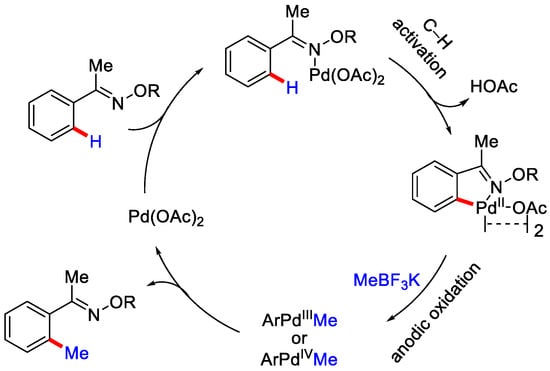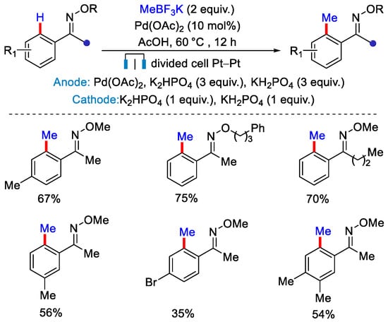 Electrochemical C–H functionalization became an advanced and efficient tool to achieve C−C bond formation in a cleaner and sustainable fashion. In electrochemical transformation, the electric current serves as an oxidant that eliminates the need of a stoichiometric amount of traditional metal based oxidants [45,46]. This also diminishes the additional side reactions. A merger of transition metal-catalyzed and electrochemical C−H methylation can help to explore the magic methyl effect in greener and sustainable fashion. In 2017, Mei and co-workers reported the first Pd catalyzed C(sp2)–H methylation of ketoximes with MeBF3K in the presence of Pd(OAc)2 under electrochemical conditions, in which electric current was used as an oxidant instead of metal oxidants (Scheme 20) [47]. Kinetic isotopic effect experiments concluded that C–H bond cleavage is not involved in the rate determining step of the catalytic cycle.