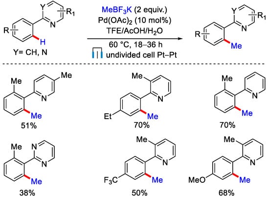 As per the plausible mechanism, first the Pd catalyst coordinates with the nitrogen atom of the substrate and then the ortho-C−H activation takes place followed by the formation of five-membered palladacycle. Then, in situ generated methyl radical (from MeBF3K) reacts with it, to produce a Pd(III) or Pd(IV) intermediate, followed by the reductive elimination of this intermediate to deliver ortho methylated product and regenerates the palladium catalyst. Pd(I) could be oxidized to Pd(II) by anodic oxidation (Scheme 21).