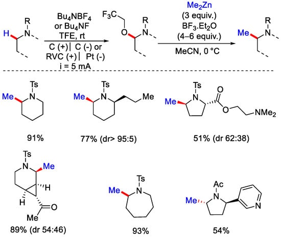 Pd(OAc)2 as a catalyst, MeBF3K as a methyl coupling partner in the presence of TFE/AcOH/H2O as a co-solvent were found to be the optimized set of reagents. Substrates containing e− rich substituents gave a good yield compared to e− withdrawing substituents. After performing some kinetic isotopic effect experiments, they concluded that C−H bond cleavage was involved in the rate determining step. This reaction mechanism was somewhat similar to their previous methodology. Very recently, Lin, Terrett and co-workers performed electrochemically driven late stage C(sp3)−H methylation of complex molecules (Scheme 23) [49]. The protocol was based on C−H activation followed by organozinc(Me2Zn)-mediated C−C bond formation. The authors employed a modified Shono-oxidation technique, which has a broad reaction scope and a high functional group tolerance. This protocol was applicable to gram scale synthesis. Drug molecules and natural products like celecoxib derivative, acetyl-nor-nicotine, and nootropic drug pramiracetam were methylated under this protocol.