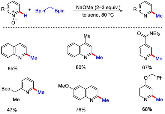 - Jo, W.; Kim, J.; Choi, S.; Cho, S.H. Transition-Metal-Free Regioselective Alkylation of Pyridine N-Oxides Using 1,1-Diborylalkanes as Alkylating Reagents. Angew. Chem. Int. Ed. 2016, 55, 9690–9694. [Google Scholar] [CrossRef]
