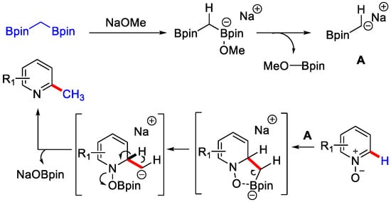 In 2015, Li, Wu and co-workers reported metal-free methylation of pyridine N-oxide derivatives with dicumyl peroxide (DCP) as a methylating reagent under heat condition in inert atmosphere (Scheme 25) [56]. The authors reported that initially two equivalents of 2-phenyl propanoxy radical were generated by the thermal decomposition of DCP, which further yielded methyl radical upon elimination of 2-phenylpropan-2-ol. Methyl radical then attacked the N-oxide and formed another active radical species. This radical species interacts with DCP and generates the methylated product with 2-phenyl propanoxy radical and 2-phenyl propan-2-ol, which on losing an H2O molecule produces 2-phenyl-1-propene. As such, the 2-phenyl propanoxy radical generated above, takes part in the new reaction cycle (Scheme 26). The major concern regarding such a radical approach is the formation of inseparable mixtures of regioisomers. In 2016, Cho and co-workers negated the use of a radical approach and reported the C−2 methylation of pyridine-N-oxides by 1,1 diboryl-methane as methyl source, sodium methoxide as base, and toluene as solvent to obtain the methylated product in good yield (Scheme 27) [57]. This method was also applicable for the methylation of complex N-heterocycles substrates like 9-O-methylquinine N-oxide.