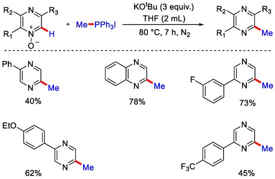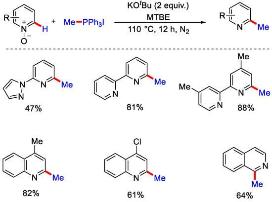 - Han, S.; Chakrasali, P.; Park, J.; Oh, H.; Kim, S.; Kim, K.; Pandey, A.K.; Han, S.H.; Han, S.B.; Kim, I.S. Reductive C2-Alkylation of Pyridine and Quinoline N-Oxides Using Wittig Reagents. Angew. Chem. Int. Ed. 2018, 57, 12737–12740. [Google Scholar] [CrossRef]