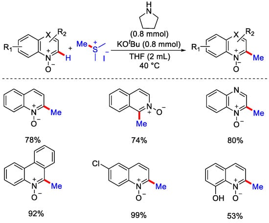 - An, W.; Choi, S.B.; Kim, N.; Kwon, N.Y.; Ghosh, P.; Han, S.H.; Mishra, N.K.; Han, S.; Hong, S.; Kim, I.S. C2-Selective C−H Methylation of Heterocyclic N-Oxides with Sulfonium Ylides. Org. Lett. 2020, 22, 9004–9009. [Google Scholar] [CrossRef]