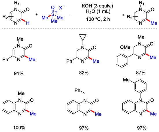 - Garza-Sanchez, R.A.; Patra, T.; Tlahuext-Aca, A.; Strieth-Kalthoff, F.; Glorius, F. DMSO as a Switchable Alkylating Agent in Heteroarene C–H Functionalization. Chem. A Eur. J. 2018, 24, 10064–10068. [Google Scholar] [CrossRef]