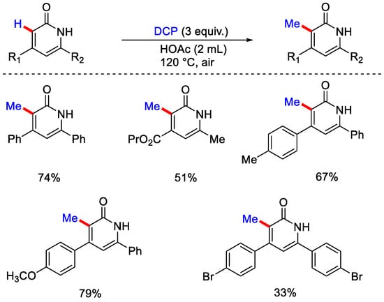 - Zhang, P.-Z.; Li, J.-A.; Zhang, L.; Shoberu, A.; Zou, J.-P.; Zhang, W. Metal-free radical C–H methylation of pyrimidinones and pyridinones with dicumyl peroxide. Green Chem. 2017, 19, 919–923. [Google Scholar] [CrossRef]