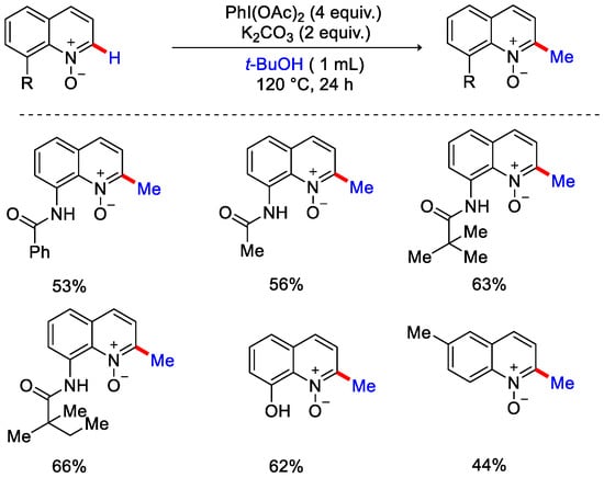 Non-phenyl substituted pyrimidinones did not give any methylated product due to their radical intermediates having less stability. Ghosh and Sen developed another metal-free approach for the methylation of quinolone N-oxides with tert-butanol as a methylating reagent, hypervalent iodine reagent PhI(OAc)2 as an oxidant and K2CO3 as a base (Scheme 35) [63].