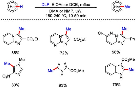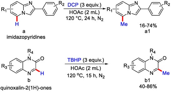 In 2020, Yan and co-workers reported the methylation of quinoxalin-2-(1H)-one and imidazo[1,2-a] pyridine derivatives with DCP as a methyl source in acetic acid under inert atmosphere and metal-free conditions at 120 °C for 24 h [65]. Both e− withdrawing and e− donating groups containing substrates produced the desired methylated product in moderate to good yield (Scheme 37). However, substrate with a methyl group at C−3 position of imidazo[1,2-a] pyridine and tert-butyl group at C−2 position did not give methylated product under the optimal reaction condition. Moreover, 2-thiophene substituted imidazo[1,2-a] pyridines gave a product with poor yield. The authors tested the radical pathway by using radical scavengers such as TEMPO, BHT and ethane-1-1-diyldibenzene. The addition of these reagents suppressed the formation of methylated product, confirming radical mechanism.