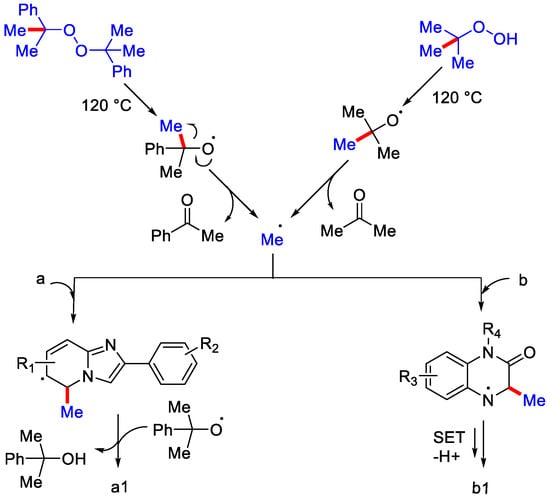 As per the proposed mechanism, upon heating, peroxides form an alkoxy radical, followed by the generation of methyl radical via β-scission. This methyl radical attacks the C−5 position of 2-phenyl imidazo[1,2-a] pyridines: (a) to form C−C intermediate, then this intermediate with 2-phenyl propanoxy radical generates the corresponding methylated product while with quinoxalin-2-(1H)-ones; (b), methyl radical reacts and forms a radical intermediate, then after SET and deprotonation generates the methylated product (Scheme 38). Metal-free C−3 methylation of quinoxalin-2-(1H)ones using tertbutylhydroperoxide (TBHP) as methylating reagent with iodine molecule and Na2SO3 as additive in acetonitrile as solvent was reported by Gu, Xia and co-workers [66]. Under the optimized reaction conditions, the authors reported the C−3 methylation of many N-substituted quinoxaline moderate yields (Scheme 39) except for N-propynyl substrate, which gave the product a lower yield due to the high reactivity of the terminal alkyne moiety.