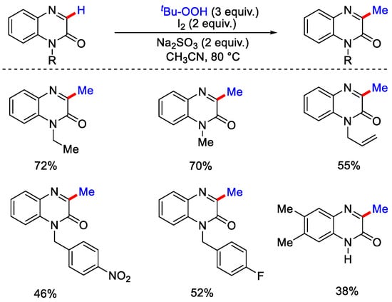 - Rong, X.; Jin, L.; Gu, Y.; Liang, G.; Xia, Q. Transition-Metal-free Radical C–H Methylation of Quinoxalinones with TBHP. Asian J. Org. Chem. 2020, 9, 185–188. [Google Scholar] [CrossRef]