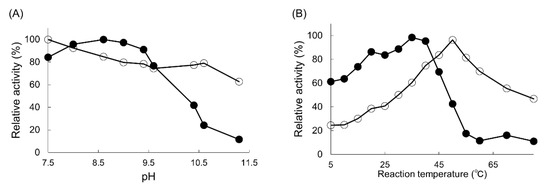 Figure 1. Effects of temperature and pH on enzymatic activity for synthesis of PPEA (●) and acetophenone (○). (A) The reaction was performed at 20 °C for 5 min using 150 mM (R)-MBA of pH 7.5–11.3) and 2 U of variant pkDAO. (B) The reaction was performed at 5–80 °C for 5 min using 150 mM (R)-MBA of pH 9.0 and 2 U of variant pkDAO. The amounts of imine and acetophenone were measured using high-performance liquid chromatography.