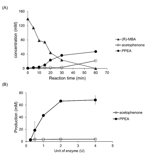PPEA synthesized from (R)-MBA was analyzed using HPLC (Shimadzu, Kyoto, Japan) with an OD-H column (Daicel Co., Tokyo, Japan) at 40 °C using a solution containing 90% hexane and 10% 2-propanol at a flow rate of 1 mL/min. The amount of product was measured at 200 nm using a UV detector. BPEA, (R)-MBA, and acetophenone were analyzed using HPLC (Waters, Toyo, Japan) with a Crownpak CR-I (+) column (Daicel Co., Tokyo, Japan) at 25 °C using a solution containing 80% 60 mM HClO4 and 20% acetonitrile at a flow rate of 0.4 mL/min.