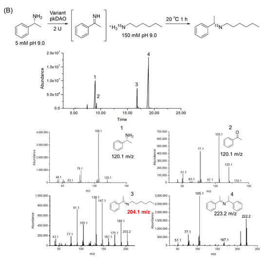 To synthesize N-hexyl-1-phenylethan-1-imine from (R)-MBA and 15N-n-hexylamine, 5 mM (R)-MBA (pH 9.0), 150 mM 15N-hexylamine (pH 9.0), and 2 U of the variant pkDAO were placed in a 1 mL reaction mixture in a shaking incubator at 20 °C for 1 h. The reaction mixture was then extracted using 0.5 mL of n-hexane with 1 mM 1,3,5-trimethylbenzylamine as an internal standard. The products were analyzed by GC/MS using an HP-5ms column.