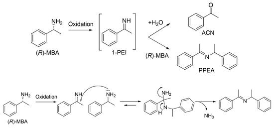 In chemical reactions, imines are generally synthesized from amines, ketones, or aldehydes in organic solvents [23,24,25]. Scheller et al. reported an imine reductase-catalyzed stereoselective amine synthesis employing a combination of carbonyls with different amine nucleophiles. They monitored imine formation from benzaldehyde and methylamine by proton NMR, yet no imines were formed from acetophenone and methylamine [26]. The data suggest that the amination of acetophenone is negligible under aqueous conditions. In this paper, we clarified that PPEA is formed from an intermediate 1-PEI and (R)-MBA with the variant pkDAO.