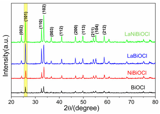 The XRD patterns of as-prepared BiOCl, NiBiOCl, LaBiOCl, and LaNiBiOCl were shown in Figure 1. The diffraction peaks of BiOCl (at 2θ = 24.16°, 25.88°, 32.56°, 33.52°, 36.72°, 40.9°, 46.76°, 49.84°, 55.16°, 58.68°) could be ascribed to (002), (101), (110), (102), (003), (112), (200), (113), (104), and (212) crystal planes, which were in good accordance with standard card (JCPDS No. 06-0249), indicating its tetragonal crystal structure [40]. NiBiOCl, LaBiOCl, and LaNiBiOCl gave similar diffraction peaks to those of pure BiOCl, but the peak intensities increased after doping Ni and/or La, indicating that Ni and La had a positive effect on the crystallization of BiOCl [28]. Especially, the diffraction intensities of the (101) crystal plane in LaBiOCl and LaNiBiOCl increased significantly, suggesting that BiOCl might grow preferentially toward this plane after La doping. Moreover, the peak center shifted to a higher 2θ (Δθ = 0.08 for (101) crystal plane) after Ni doping due to the smaller radius of Ni2+ (69 pm) compared to that of Bi3+(103 pm), which caused the lattice shrinkage [41]. The shift also confirmed the successful substitution of Ni2+ for Bi3+. Meanwhile, no obvious peak center shift was observed after doping of La because of their equivalent radius of Bi3+ and La3+(101 pm). The diffraction peaks of Ni, La, and other elements were not observed, indicating the higher purity of the as-prepared photocatalysts.