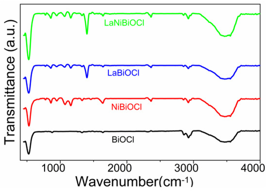 The surface functional groups of prepared samples were analyzed by the FT-IR method (Figure 2). The bands centered at 3420 cm−1 and 1640 cm−1 could be assigned to the O-H stretching vibration of surface hydroxyl and H-O-H bending vibration of water adsorbed on the surface, respectively, which could generate hydroxyl radicals under irradiation [42]. The bands at 2800–2930 cm−1 were ascribed to the symmetric and antisymmetric stretching vibration of -CH2- since ethanol was used as a solvent in the preparation process [43]. The characteristic Bi-O vibration shifted from 528 cm−1 in BiOCl to 526 cm−1 after Ni and/or La doping, indicating the component change of the photocatalysts [44].