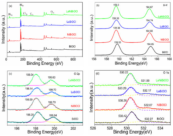 The chemical state of surface elements and the effect of doping on the coordination environment were further analyzed by the XPS method (Figure 3). Bi, Cl, and O were observed in all samples (Figure 3a). However, Ni and La were not observed in a survey and high-resolution scan of NiBiOCl, LaBiOCl, and LaNiBiOCl, which might be due to the low doping amount of Ni (2‰) and La (2‰). The high-resolution Bi 4f spectra are shown in Figure 3b. For BiOCl, two characteristic peaks at 159.55 eV and 164.85 eV could be ascribed to Bi 4f7/2 and Bi 4f5/2, indicating the existence of Bi3+ [45,46]. The spacing of the two peaks was 5.3 eV, indicating the normal state of Bi in BiOCl [47]. After doping of Ni and/or La, these two peaks shifted to a lower position because of the increase in the electron density of Bi, which was the result of an increase in oxygen defects formed from the substitution of Bi by Ni or/and La. The high-resolution Cl 2p (Figure 3c) of BiOCl showed two peaks at 199.85 eV and 198.2 eV, which were ascribed to Cl 2p1/2 and Cl 2p3/2, respectively. For high-resolution O 1s spectra (Figure 3d), multiple chemical states were observed in NiBiOCl, LaBiOCl, and LaNiBiOCl. The peaks at about 530 and 532 eV were ascribed to lattice oxygen and oxygen defects [48]. The binding energy of the oxygen defect of LaNiBiOCl shifted 0.38 eV to the lower direction, while the corresponding shifts for NiBiOCl and LaBiOCl were 0.2 and 0.1 eV, respectively. This result suggested that there were more defects or water adsorbed on the surface of LaNiBiOCl, which was beneficial to improving its photodegradability.