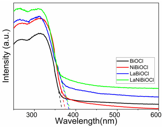 UV-Vis spectroscopy was used to evaluate the light utilization of the photocatalyst. It can be seen in Figure 5 that the absorption edge shifted slightly to red after doping, and the absorption in the visible region was greatly improved for LaBiOCl and LaNiBiOCl. The band gap values estimated from the diffuse reflectance spectra were 3.38, 3.31, 3.24, and 3.22 eV for BiOCl, NiBiOCl, LaBiOCl, and LaNiBiOCl, respectively. The conduction band (CB) minimum of BiOCl was occupied by Bi 6p, while the valence band (VB) maximum was composed of O 2p and Cl 3p. When Bi3+ was replaced by Ni2+ and/or La3+, the CB decreased; when the surface oxygen vacancies increased the VB width, these two aspects led to a decrease in the band gap of BiOCl [32].