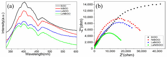 PL was used to investigate the recombination efficiency of photogenerated electrons and holes [50,51]. The PL (Figure 6a) intensities at 470 nm were in the following order: BiOCl > NiBiOCl > LaBiOCl > LaNiBiOCl. A weaker PL intensity suggested a higher efficiency of photogenerated electron–hole separation. Thus, LaNiBiOCl was better than the others in terms of photogenerated carrier separation, resulting in higher photocatalytic activity. The oxygen vacancies formed by Ni and/or La doping could capture photoelectrons and thus promote the separation of photogenerated electrons and holes.