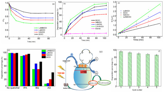 Stability was another important factor in evaluating the application of the photocatalyst. Figure 7f shows the stability of LaNiBiOCl after five recycles of photodegradation. The degradation percentage of the fifth cycle was 85.9%, which was a 10% decrease compared with the initial one (95,5%); this decrease was partially related to the loss of LaNiBiOCl during the recycling experiment. Thus, LaNiBiOCl exhibited very good stability.