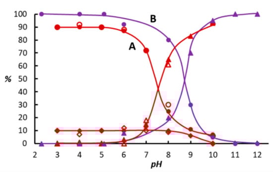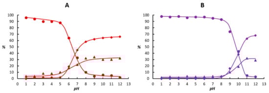 Distribution of the various Ru(II)-hydride species formed in aqueous solutions of [{RuCl(mtppms-Na)2}2(µ-Cl)2], 1 + mtppms-Na under H2, as a function of pH in the absence (red, A) and in the presence (purple, B) of NaI, determined by 1H NMR (open symbols) and 31P NMR spectroscopy (filled symbols). [RuHCl(mtppms-Na)3], 2 (●,◯); [{RuH(mtppms-Na)2}2(µ-Cl)2], 6 (♦,⋄); [RuHI(mtppms-Na)3], 5 (●); cis,fac- [RuH2(H2O)(mtppms-Na)3], 3 (▲,△,▲). Conditions: A) [Ru] = 2.4 × 10−2 M, [mtppms-Na]/[Ru] = 3, T = 50 °C, P(H2) = 1 bar,; B) same as A but with [NaI] = 0.2 M. The pH of solutions for spectral measurements were adjusted by appropriate amounts of HCl and KOH.