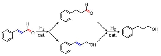 - Sánchez-Delgado, R.A.; Medina, M.; López-Linares, F.; Fuentes, A. The chemistry and catalytic properties of ruthenium and osmium compounds. Part 7. Regioselective hydrogenation of cinnamaldehyde (3-phenyl-2-propenal) catalyzed by Ru and Os triphenylphosphine complexes in homogeneous solution and by meta-sulfonatophenyl-diphenyldiphosphine (TPPMS) and tris-meta-sulfonato-phenylphosphine (TPPTS) derivatives in an aqueous biphasic system. J. Mol. Catal. A Chem. 1997, 116, 167–177. [Google Scholar] [CrossRef]