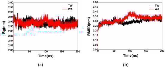 After 200 ns simulations, the radius of gyration (Rg) of the main chain and RMSD of the backbone Cα atoms of the two complexes were calculated to evaluate if these complex systems could reach equilibrium during the simulations [19,20]. As illustrated in Figure 1a, the Rg of the MGAM-TW and MGAM-WA complexes could be stabilized around 2.90~2.93 nm. The results indicated that the volume and shape of the MGAM could be in stable states during the simulations. As shown in Figure 1b, most of the RMSD values in the MGAM-TW and MGAM-WA complexes could be stabilized at around 0.25~0.35 nm. However, the RMSD values of MGAM-WA complexes increased significantly over the time period of 80 ns to 100 ns, indicating that the backbone of MGAM-WA might have been perturbed during this time period. Based on the above results, the structures during 100 to 200 ns stages were considered to analyze the optimal binding configurations between MGAM and the peptides [21].