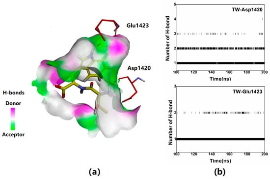 (a) Predicted detailed binding modes of MGAM-TW complex from cluster 1 and (b) the number of H-bonds between TW and Asp1420/Glu1423 during 100~200 ns simulation.