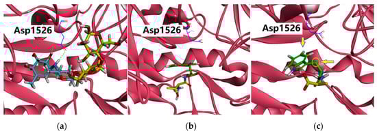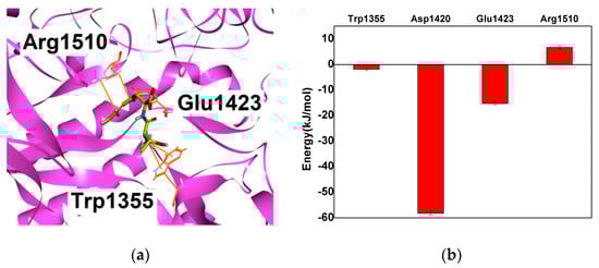 To further determine the binding ability between the active-site residues and TW, the energy contributions of the residues mentioned above were calculated. As shown in Figure 5b, the energy contributions of Trp1355, Asp1420, and Glu1423 were −1.95 ± 0.41 kJ/mol, −58.15 ± 0.70 kJ/mol, and −15.32 ± 0.57 kJ/mol in cluster 1 of MGAM-TW, indicating Asp1420 and Glu1423 might be the vital residues for the binding of TW. Notably, the binding energy values of Arg1510 were found to be positive in cluster 1, indicating that the unfavorable energy contributions could be provided by Arg1510, although it could potentially form a cation-π interaction with TW, as shown in Figure 5a.