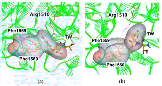 As shown in Figure 6, the orientation change could be observed on the side chain of Arg1510 during simulation. This change potentially permitted the binding site of MGAM to accommodate an altered conformation of TW. Indeed, an angle deflection could also be observed on the Arg1510 side chain during simulations, as illustrated in Figure S5. During 0 ns to 27 ns, the deflection degree of Arg1510 side chain could reach up to 30° to 70°. According to the further analysis, before 27 ns, Trp2pep could be found in the proximity of the hydrophobic residues, Phe1559 and Phe1560, at the active site, implying that hydrophobic interactions might play a critical role in the peptide binding process, as shown in Figure 6a. However, the amino group of Thr1pep in the current pose was adjacent to the guanidine group of Arg1510, causing the exclusion of positive electric groups. To reduce the binding energy, the TW transferred into another pose after 27 ns, as shown in Figure 6b. The results above indicated that the active center of MGAM could be very permissive towards the binding of flexible peptides.