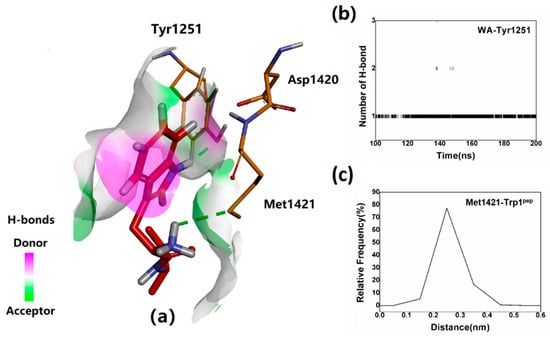 Subsequently, the binding conformation was also evaluated in cluster 1 of the MGAM-WA complex. As shown in Figure 7a,b, one H-bond was formed between the side chain of Tyr1251 and the indole group of Trp1pep. In addition, a H-bond was also formed between the side chain of Met1421 and the amino group of Trp1pep. It is known that the energy of a H-bond formed with a sulfur atom may be slightly lower; however, even under these circumstances, this H-bond could contribute positively to WA binding. As shown in Figure 7c, the distance between the amino group of Trp1pep and the sulfur atom of Met1421 was approximately 2.60 Å most of the time, which might be advantageous for H-bond formation.