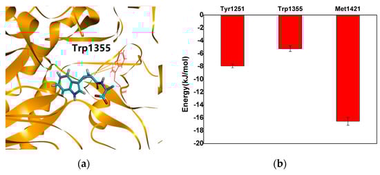 (a) The cation-π interaction of cluster 1 from MGAM-TW and (b) the energy contributions of the vital residues of cluster 1 from MGAM-TW. The errors marked on the graph represent the absolute errors of the data.