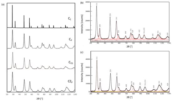 A D5000 horizontal goniometer (Bruker AXS GmbH, Karlsruhe, Germany) was used to obtain the XRD patterns with the following parameters: radiation source: Cu (Kα radiation, 1.5418 Å, 40 kV, 40 mA); divergent Bragg–Brentano optics; LynxEye detector; scattering angle range: 20 to 130°. The data were analyzed as in []. The average particle size (D) was determined using the Scherrer equation.
