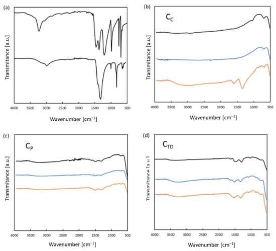 Attenuated total reflection Fourier transform infrared spectroscopy (ATR-FTIR) measurements were carried out using a Spectrum Two instrument (Perkin Elmer). For each sample, four scans were collected with a resolution of 4 cm−1 within the range of 450 to 4000 cm−1.