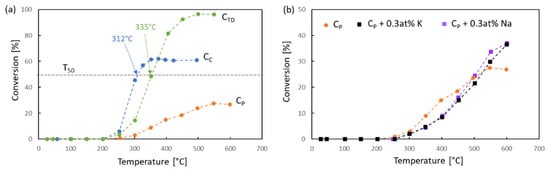 The effect of doping the precipitated ceria support with 0.3 at% potassium and sodium ions on its activity in CO oxidation in the model stream is shown in Figure 5b. The precipitated ceria doped with potassium and sodium carbonate achieved a similar CO conversion to that of the undoped precipitated ceria. However, there seem to be two different regions. In the range of 250–500 °C, both the alkali-doped supports have a lower CO conversion, and above that temperature, the same two samples exhibit a higher activity than the undoped ceria. If the levelling off of the curve for the undoped support is due to coke formation, then the increased activity of the alkali-doped samples may be attributed to their activity in combustion of carbonaceous deposits and increasing the surface of ceria, which participates in CO oxidation.