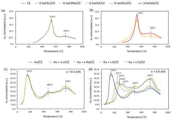 The TPR profiles of the same cerium–zirconium mixed oxide doped with 0.3 at% lithium, sodium, potassium and caesium ions are presented in Figure 7a. It can be seen that the curves are very similar and do not exhibit any pronounced differences. All of them have a low temperature reduction peak with a maximum at 539 °C and a much broader, higher-temperature reduction peak with a maximum at approximately 740 °C. However, when comparing the TPR profiles of the support doped with 0.3 and 3.0 at% K (Figure 7b), the shape changes, and the higher loading shifts the reduction temperature of the beginning of the reduction to higher values, although the maxima of neither reduction peaks are affected by the change of loading. The TPR profiles of the gold catalysts doped with 0.3 at% alkali cations all have the same shape and three reduction peaks with maxima at 144 °C, approximately 485 °C and 730 °C. A comparison of the gold catalysts with 0.3 and 3.0 at% alkali ions indicates that the loading does not change the reducibility of the lithium-doped catalyst. The shape of the TPR profiles of the other samples changes significantly upon the loading increase, and the first reduction peak is shifted to 255 °C for sodium, i.e., more than 100 K. It is shifted even further, to 267 °C, in the presence of 3.0 at% potassium ions. Both the Tmax and the shape of the first reduction signal change (Figure 7c,d). It is noteworthy that the high-temperature shoulder visible in the profile of the catalyst doped with 3.0 at% sodium ions (Figure 7d grey curve) is more pronounced in the profile of the potassium-doped catalyst, and in the case of the caesium-doped sample, there are two maxima. The small middle signal merges with the first one. The third reduction signal is widened for catalysts with 3.0 at% Na, K and Cs but not for the Li-doped sample. This is due to the much lower mobility of lithium ions compared to that of the other alkali metal ions, which has been thoroughly studied in coal gasification [].