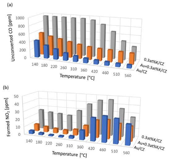 Studies in the complex stream, which, apart from CO, contains other components (for the detailed composition, see Materials and Methods), show that although the effect of potassium ions on the activity of a gold catalyst in CO oxidation is detrimental (Figure 9a), as reported by us earlier [], its effect on the availability of oxygen for oxidation of NO is not correlated with the reducibility of the catalyst (Figure 9b). The amount of formed NO2 in the post reaction mixture is greater for the Au + K/CZ catalyst than for Au/CZ for temperatures below 350 °C, which might be attributed to the effect of stabilization of NO on the surface by the potassium ions, as concluded from the DFT calculations of NO adsorption on carbon []. However, at higher temperatures, i.e., above 350 °C, the reverse is true, and the amount of NO2 formed is greater on Au/CZ. This might suggest a change in the mechanism of NO oxidation above this temperature. A different mechanism for NO oxidation on chabazite zeolites was proposed in [] and was explained as transition of the active sites. The NO2 concentration in the outlet stream of the potassium-doped support is much higher than for Au + 0.3 at% K/CZ, which indicates a strong interaction of potassium ions with gold. In contrast, no such change is visible in the levels of unconverted CO (Figure 9a).