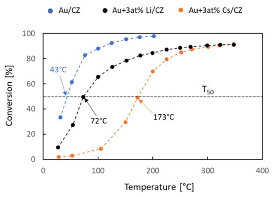 Because in coal gasification studies lithium has been shown to be the worst catalyst among alkali metal ions and caesium was shown to be better than lithium, sodium, potassium, Li and Cs cations were introduced onto the surface of a preloaded gold catalyst and tested in the model stream. Their loading was 3.0 at% instead of the 0.3 at% applied in the previous tests to verify if the conversion of CO over the alkali-doped catalysts, approaching that of the undoped catalyst due to a low alkali loading or because the effect of the alkali metal ions, becoming negligible at higher temperatures. If the former is true, then for a higher loading, there would most likely be a lower value, which the conversion curves would be approaching. If the latter is true, the effect would probably also become negligible for the higher loading. The CO conversion curves in the model stream, as well as T50 values, are displayed in Figure 10. The activity of both the lithium-ion-doped and the caesium-ion-doped gold catalysts approaches the same final value, which is lower than that observed for the undoped gold catalyst.