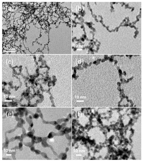 TEM images of (a,b) Pt50Pd50, (c) Pt20Pd80, (d) Pt80Pd20, (e) Pd, and (f) Pt aerogels.