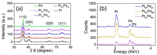 (a) XRD spectra of PtxPdy bimetallic and Pt, Pd monometallic aerogels. (b) TEM–EDS of Pt80Pd20, Pt50Pd50, and Pt20Pd80 aerogels.