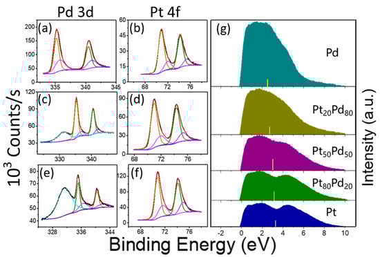 XPS spectra of (a,b) Pt20Pd80, (c,d) Pt50Pd50, and (e,f) Pt80Pd20 aerogels; (g) surface valance band spectra of the Pt, Pd monometallic aerogels and PtxPdy bimetallic aerogels. All the spectra were corrected using a Shirley background. The yellow bars indicate the location of the d-band center.