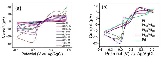 The performance of PtxPdy aerogels on glassy carbon electrodes (GCEs) toward the electrocatalytic reduction reaction of H2O2 (H2O2RR) was investigated in detail by cyclic voltammetry (CV). Figure 4a shows the electrocatalytic current response of the Pt50Pd50 sensor in the absence and presence of H2O2 between 0 and 2.0 mM within −0.64−0.96 V vs. Ag/AgCl. It is evident that excellent electrocatalytic response can be observed, and electrochemical reduction current at about −0.15 V gradually increased with the increasing concentration of H2O2.