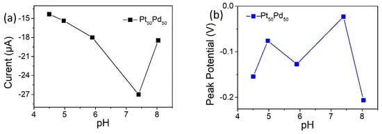 (a) CV peak currents of Pt50Pd50 in PBS solutions with different pH comprising 1 mM concentration of H2O2. (b) Peak potentials of Pt50Pd50 in PBS solutions with different pH comprising 1 mM concentration of H2O2.
