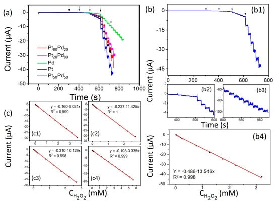 (a) Amperometric responses of the aerogel modified electrodes with successive addition of 2 × 10−5 M (50 μL), 0.002 M (50 μL), 0.02 M (50 μL), 0.6 M (17 μL), and 1 M (10 μL) into 20 mL N2-saturated 0.1 M PBS aqueous solution at −0.05 V. (b) (b1) Amperometric responses of the Pt50Pd50 aerogel modified electrodes (b2,b3). Enlarged part of amperometric response of Pt50Pd50 aerogel modified electrode. (b4) Calibration curve of the Pt50Pd50 for H2O2RR in N2-saturated PBS aqueous solution. (c) (c1–c4) Calibration curve of Pt20Pd80, Pt80Pd20, Pt, and Pd for H2O2RR in N2-saturated PBS aqueous solution.