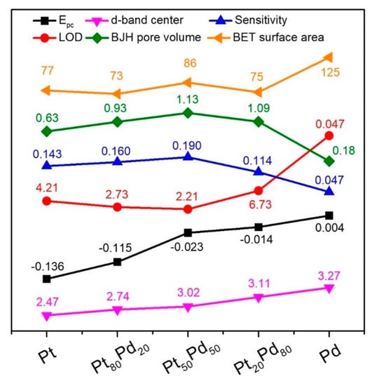 Figure 7 shows the relationship between the atom ratios of Pt and Pd in the PtxPdy bimetallic aerogels and their electrochemical sensing performances, including the sensitivity, LOD, and potential of reduction peak (Epc), as well as the physical properties, including the d-band center, BET surface area, and cumulative pore volume. Compared with the other as-prepared aerogel sensors, the Pt50Pd50 bimetallic aerogel-based sensor is the optimal one, showing higher sensitivity, broader linear range, and lower detection limit in H2O2 detection. The excellent electrocatalytic response of the Pt50Pd50 aerogel is closely related to the synergy bimetallic effect. Based on the d-band center energy theory (εd) [36], milder binding energy to the reaction intermedia is beneficial for the release of products and adsorption of reactants, thus leading to better catalytic performance. The appropriate downshifted d-band center of Pt50Pd50 aerogels caused by alloying effect and electronic effect might be one reason for the higher sensing performance of the Pt50Pd50 aerogel than other PtxPdy aerogels [27,37]. As for the influences of BET surface area, pore size distribution, and cumulative pore volumes, it is found that there are no direct influences of BET surface area and pore size distribution [30] on sensing performance; however, the changing tendency of cumulative pore volume with Pt/Pd ratio is the same as the PtxPdy aerogels’ sensitivity and contrary to the onset potential. The biggest pore volume may also be one of the reasons for the better sensitivity and lower onset potential of the Pt50Pd50 aerogel than the other PtxPdy aerogels. Meanwhile, the advanced structure of NMAs, including the high hierarchically porous 3D network, interconnected nanowires, faster electron and mass transport, more abundant active sites, and excellent structural stability, should be also considered.
