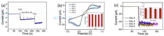 Five different Pt50Pd50-modified electrodes prepared under the same conditions were used to test the reproducibility of this sensor by measuring the current responses to a concentration of 1 mM H2O2. Obviously, Figure 8b shows an excellent reproducibility of the aerogel sensor with the relative standard deviation (RSD) of 3.26%.