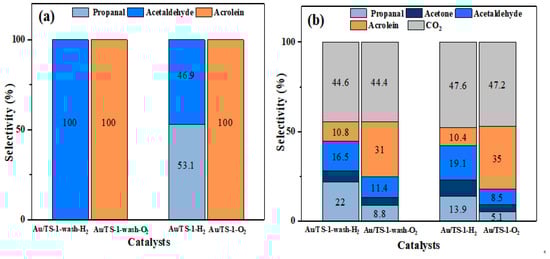 For Au/TS-1 catalyst, vacuum drying at room temperature is the first choice of many researchers []. The method of activating the catalyst by raw gas has also been reported in some studies. Ren et al. studied the effect of different temperatures and different pretreatment conditions on Au/TS-1 catalyst performance []. At 300 °C, pretreatment with H2-C3H6 gas can provide the best propylene epoxidation activity. The hydrophobicity of the Au/TS-1 surface was enhanced through organic functional modification, and the adsorption of propylene and desorption of PO were strengthened. However, the effect of pretreatment in H2 and O2 on Au/TS-1 is still unclear.