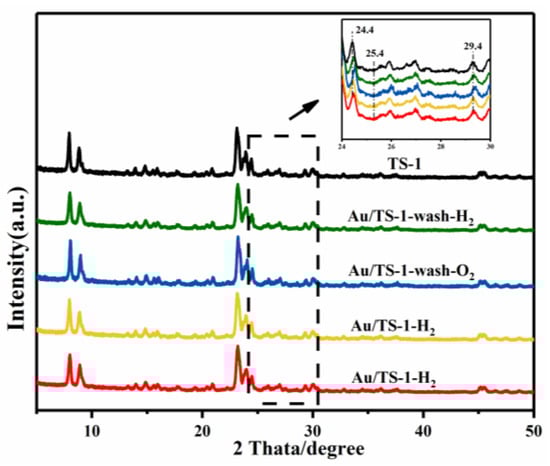 Figure 3 shows the XRD pattern of TS-1 and the studied catalysts. Diffraction peaks are located at 2θ = 7.9, 8.8, 23.1, 23.9, and 24.4°, which confirms the MFI structure of TS-1. The two single diffraction peaks at 24.4 and 29.4° indicate the existence of the cell structure of the orthogonal crystal system, which is mainly caused by the isolated four-coordination titanium atoms entering the molecular sieve framework []. Almost no diffraction peak appeared at approximately 25.4°, a characteristic peak of anatase TiO2, further indicating that most of the titanium species in the support exists in the framework of the MFI structure []. However, the relative crystallinity, which was calculated by dividing the total intensity of the characteristic peaks of the samples by that of the standard TS-1, was low (only 87%) for the current sample [], indicating that the purity of TS-1 was lower. In addition, the diffraction peaks of Au (2θ = 38.2 and 44.4°) were not detected in the pattern of all Au-TS-1 catalysts, indicating good dispersion of Au nanoparticles or lower loading of Au nanoparticles [].