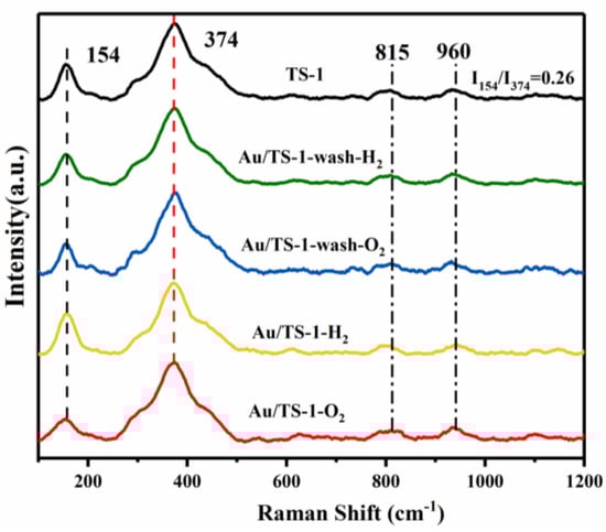 Raman resonance spectroscopy was used to quantitatively analyze the content of anatase TiO2 in the samples. As shown in Figure 4, the bands at 374, 815, and 960 cm−1 are characteristic of the MFI topology and the appearance of the strongest anatase TiO2 characteristic peak at 154 cm−1 confirms the existence of anatase TiO2 in as-synthesized TS-1 []. The relative intensity of the bands at 154 and 374 cm−1 (I154/374) can be used to calculate the relative content of anatase TiO2 []. The calculated value of I154/374 TS-1 is 0.26, indicating a small amount of anatase TiO2 in as-synthesized TS-1 support.
