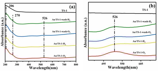 The coordination environment of titanium atoms in the catalyst was analyzed by UV-Vis spectroscopy. As shown in Figure 5a, an adsorption peak appeared at 206 nm for all samples, which can be attributed to the electron transfer between O2− and Ti4+ in TS-1. This is evidence of the entry of Ti into the framework of the TS-1 molecular sieve and the formation of TiO4 tetrahedral, accordingly confirming the presence of isolated Ti (IV) species in the MFI framework []. Unlike TS-1 support, Au/TS-1 catalyst has two weak absorption peaks in the spectrum. The shoulder peak at 270 nm could be caused by KOH applied during the loading of Au, which partially degraded the coordination environment of the skeleton titanium atom in TS-1 support and changed the coordination environment []. As shown in Figure 5a,b, the absorption peak at 526 nm can be attributed to the plasma resonance generated by Au particles in the catalyst, indicating that Au species on the catalyst are reduced [].