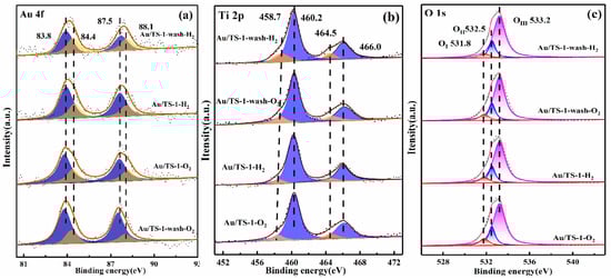 The chemical states of Au, Ti, and O in the Au/TS-1 catalysts calcined in different gaseous environments were determined by X-ray photoelectron spectroscopy (XPS), as shown in Figure 6a. For all the studied catalysts, two binding energy peaks at 83.8 and 84.4 eV were assigned to the Au0 and Au+ species, respectively []. The corresponding quantification analysis of Au species for Au/TS-1 calcined in different gases are shown in Table 2. Au/TS-1 pretreated with O2 had more metallic Au species (71.1%, 77.6%) than that of Au/TS-1 pretreated with H2 (55.1%, 68.4%). These results show that the calcination atmosphere can modulate the chemical states of Au on Au/TS-1. According to the literature, the chemical state of Au species is related to the product selectivity of propylene epoxidation. Metallic gold is favorable for the epoxidation of propylene with oxygen and hydrogen to form PO, while oxidized gold may promote the hydrogenation of propylene to produce propane byproduct []. However, there are also reports in the literature that an appropriate amount of gold oxide is conducive to the adsorption of oxygen in the reaction [,].